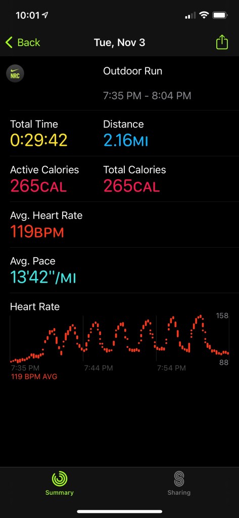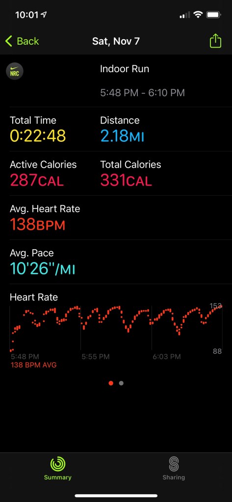 My final run of the week was Saturday, 11/7/20, and it was my long run. The plan was 2 miles. Although I would typically prefer to have a day rest, I was going hiking all day Sunday so I didn’t want to then try to run after. I decided to try out using the Nike Run Club app on my watch to start. I made sure it was noted I was doing an indoor run. The app overall worked, but not how I had hoped. There is no lap function, so I didn’t have my segments to review afterward. I definitely won’t be using the Nike app for tracking my runs.