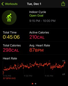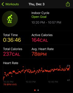 NRC had me set to do a 0.5 mile benchmark run. However, doing the benchmark is rather worthless since I am not using the phone app when I am running. Therefore, it does not track the proper intervals and then apply to my training plan. Therefore, I decided just do a ride, especially since it was late. I put in some high effort and got my ride done in about 36 minutes. However, when I reviewed my data, I saw that my HR maxed at 89 BPM, which is really low. My only thought is that I was really tired and my perceived effort was much higher than actual. I did also workout after 10pm, so this does make sense.