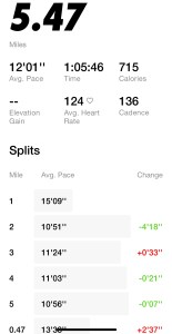 The plan called for a rest day. However, I was a bit bummed I didn’t run on Tuesday, so I decided to get in a run today. I did my usual warm-up, followed by my Tuesday scheduled 3 x 800 m intervals. I went at 7.2 mph and was exhausted at the end. My knees were bugging me slightly afterwards. I am sure it was my form. Even though I should be able to handle 7.2 mph, I noticed my stride, especially on the 3rd interval, was getting a little too long and I did over-extend a couple times. I’ll work on this, but to be safe, I’ll probably drop the pace down to 7 mph next time.