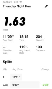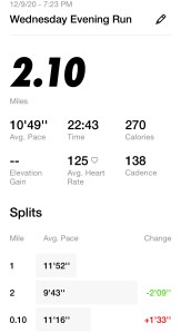 Once I got my warm-up done, I decided I would do my Monday run, which was supposed to be an endurance 2 miler. Instead of doing an endurance pace, which is similar to an easy run, I did a tempo 2 miler. As always, I am doing the Galloway method with run/walk, where I do 2 minutes running, walking 30 seconds. The run felt really good, but I am still surprised how high my HR gets when I run now. Well, it’s high for me, but normal range based on my age and physical conditioning.