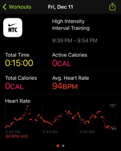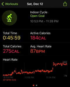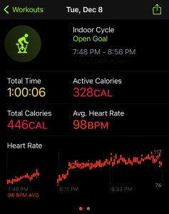 I was supposed to do an endurance 2 mile run, but I was exhausted and just wanted to get my rings closed, so I hopped on the bike. Unfortunately, I was so tired that I wasn’t able to get my HR high enough, so I ended up biking for 50 minutes and still could not close my 30 minute exercise ring. I therefore hopped onto the treadmill and walked for about 25 minutes. One might say I should have just run. However, my form has always suffered when I am tired, so it was still a smart move to bike and walk. Walking would have closed my ring quicker, but we only have one treadmill, and my wife suffers the same insane work schedule.