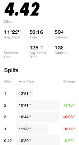 My plan called for a 4 x 400 m interval session today. That’s exactly what I did! Did my NTC warm-up, then hopped on the treadmill for my intervals. As a quick note, when I am doing my intervals on the treadmill, even though I am doing Galloway, I will complete the full interval with running only. For example, I am usually doing my intervals at 7 – 7.2 mph (8:34 to 8:20 pace). This means that my 400 m split will always be over 2 minutes. If I were running outside, I would follow Galloway still; however, it’s a bit tough on the treadmill because you cannot adjust the speed that quickly. So, for a better training experience, I do the whole interval running. I do this for my 800s as well.