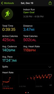 And I’m back! Got in my usual NTC Wake-Up Warm-Up and then proceeded to run. My long run called for 6 miles, but since I had missed the whole week in regards to my running plan, I opted to do 3 mile runs for Saturday and Sunday to ease myself back into my training plan. Plus, I don’t want to get injured. I got in my 3 mile run and felt great! However, I was not as consistent with my Galloway intervals. In addition to that, my watch really glitched so my stats are either tough to read or there is a huge gap of darkness in the middle. I am assuming that is why Apple Watch thought I ran a lot further than I actually did. Oh well, still got in a solid 39 minutes run.