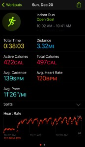 Round 2 for my 3 mile runs. Got in my warm-up and started my run. Got done in about 38 minutes and felt really good, even though a bit tired. I was much more consistent today with my Galloway intervals of 2 minutes run, 30 seconds walk. I didn’t have any watch issues so everything was tracked well, and the Apple Watch was not too far off in regards to the distance. With not running at all during the week or doing any strength training, both of my 3 mile runs were a bit tougher than usual.