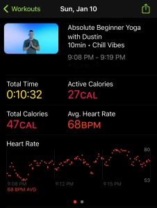 First up, I tried Absolute Beginner Yoga with Dustin, which was a 10 minute workout. The soundtrack for this was Chill Vibes. I decided to use my Apple TV instead of my iPad so I could have a better viewing area. Overall, this was a really nice and relaxing workout.