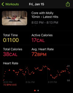 As usual, my Friday workout was a NTC workout. I wanted to try out more of the Apple Fitness+ workouts, so I started off my usual NTC warm-up, but then moved into the Fitness+ app. I am pretty much going to be only using my iPad after the connectivity issues with Apple TV last time. I started off with a 10 minutes workout, Core with Molly. It didn’t have any moves that were challenging for me, but still gave me a workout, which was nice. I still had a lot of energy, so I then tried out another 10 minute workout, HIIT with Kim. I didn’t get my HR very high, but again, it was a good and fun workout. I definitely recommend Fitness+ workouts to anyone who is looking for short, beginner-focused workouts. They usually show you the proper form, which is especially important for beginners. For me, they are great because my strength isn’t what it should be, and doing most of the NTC workouts are a bit too much for me right now.