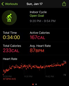 Even though I did my warm-up and two Fitness+ workouts, I still needed to burn more calories to close my rings, so I hopped on the trainer for about 13 minutes, peddling as hard as I could. I was happy to see I got up to 127 BPM, but still expected it to be higher with how I felt during the ride. I definitely think my conditioning has improved greatly.