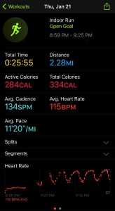 NRC called for a 6×400 meter (1/4 mile) speed work. I warmed up with my NTC Wake-up Warm-up. Again, had an issue where my watch didn’t track any HR during that. It’s been extra cold in the basement, so I have been warming up with my sweatshirt on. I wonder if it got caught under the watch slightly. I’ll definitely need to be more careful.
