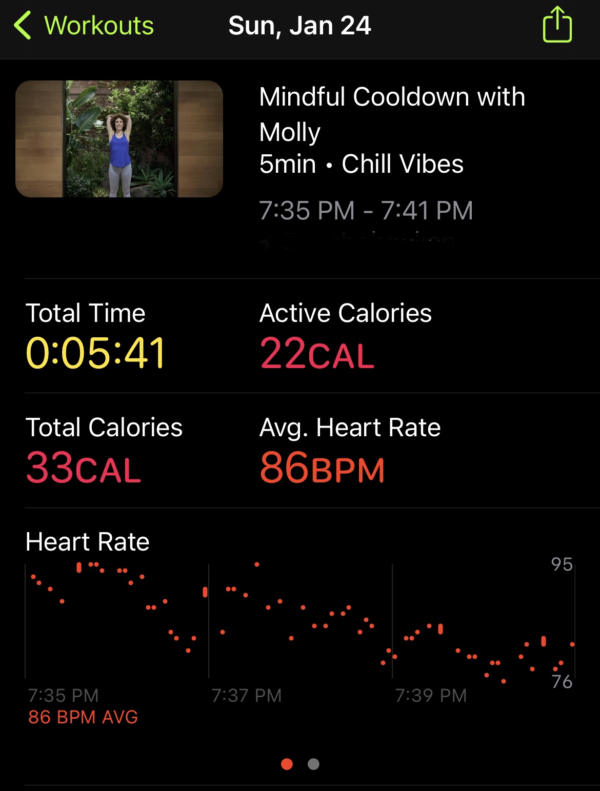 I started off with my NTC Wake-up Warm-up to get loose. I then followed that up with Fitness+ HIIT with Kim, which was a 20 minute HIIT workout. This really got my HR up and was a lot of fun. Nothing was overly challenging, but they still had modifications, which is really nice. To cool down I decided to try out one of the Mindful Cooldown routines; Mindful Cooldwon with Molly. At first it seemed kind of pointless, as there was not very many moves. But the combination of breathing and with the few moves really relaxed me a lot. As you can see from the HR graph, it worked really well, and it was only 5 minutes! I really want to start doing more cool downs like this, as it really helps both mind and body, especially after any intense workout.