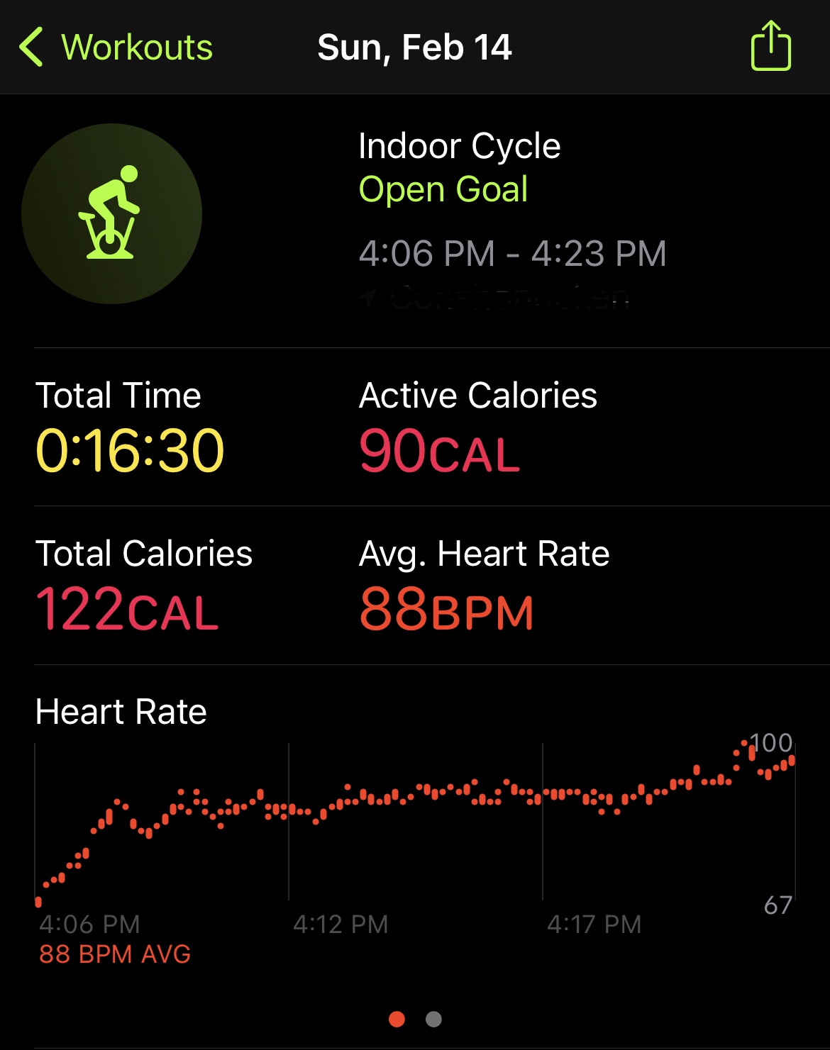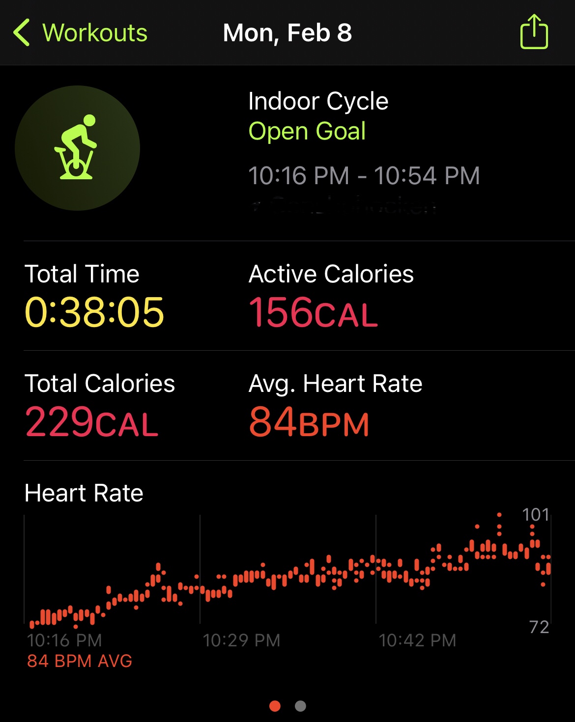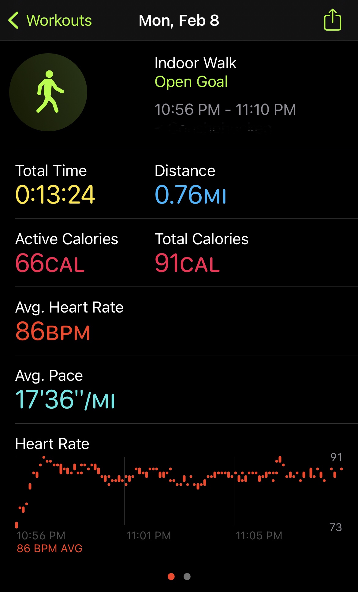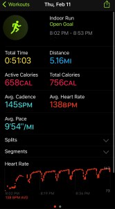 Another long work day. I didn’t get done until 10pm and I didn’t have the energy for my planned 5.75 mile endurance run. I hopped on the trainer for 38 minutes, but I was not being successful at closing my rings. I also was just not feeling it for my ride, as you can see from my heart rate. Despite keeping a consistent and slow pace, my HR still steadily increased. So, I got off the bike and decided to walk for 13 minutes to finish out my rings. I went at my normal 3 mph walking pace. Overall, I wish I had just walked and did some mindful cooldown with Apple Fitness+.