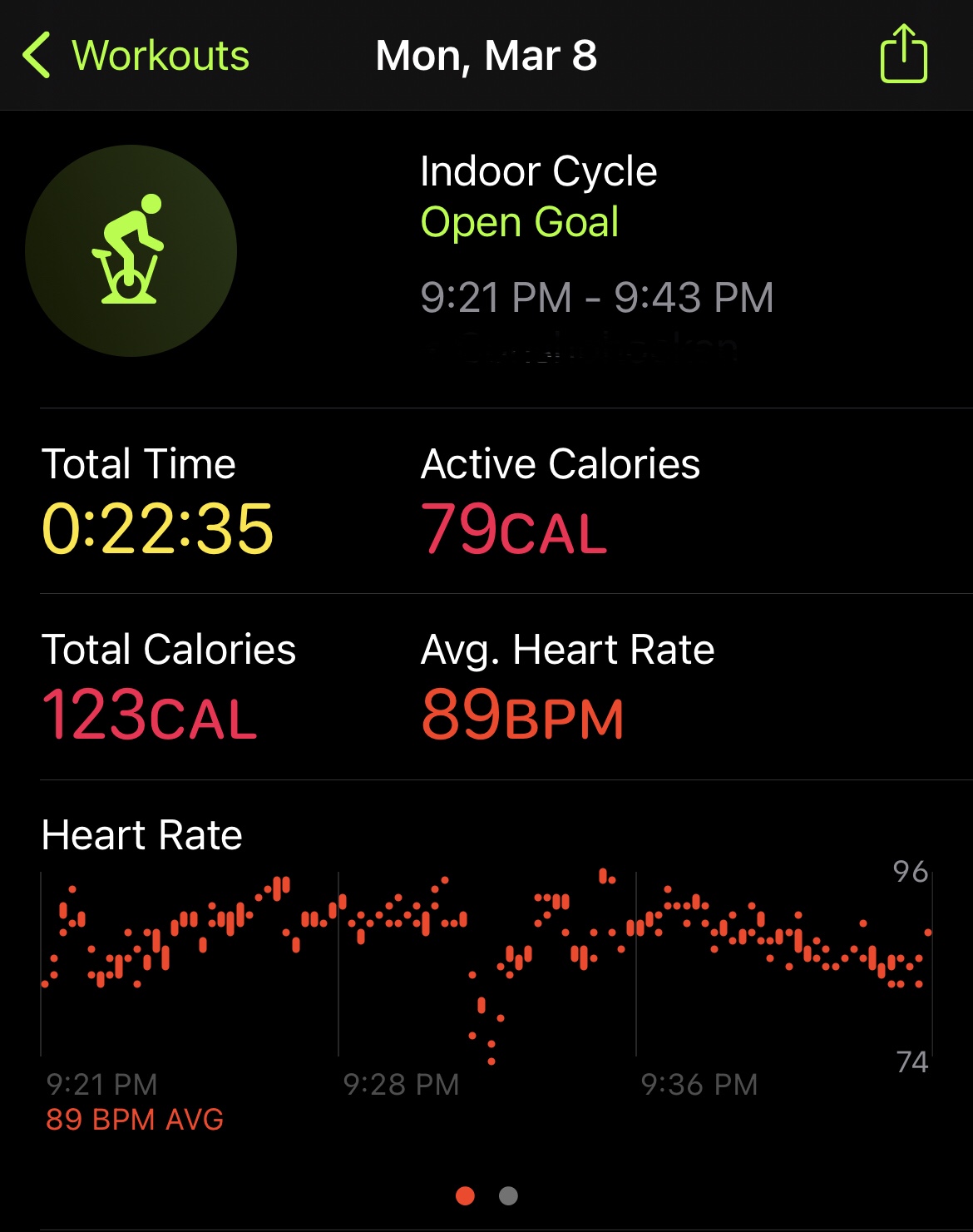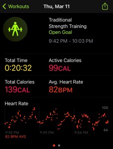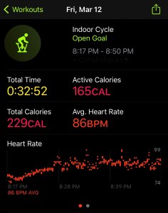To start off my week, my Nike Run Club plan called for an endurance 4 mile run. I wasn’t in the mood to workout, but knew I needed to get in something, and it needed to be running. So I did my planned Tuesday workout, 3 x 400 meter speed work. I did my usual NTC Wake-up Warm-up and started off with my 5 minute warm-up walk. I then did the 3 intervals. I pushed myself and went at 7.2 mph. As I have noticed with all of my runs that are in the evening, my heart rate was a bit elevated, topping out around 153 BPM. Even though it was consistent for all 3 intervals, I was extremely exhausted when I was done. And of course, that was not enough to close my rings, so I hopped on my bike and rode for 22 minutes. Overall it was a good workout, but I was mentally not excited about getting in the workout at all.