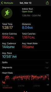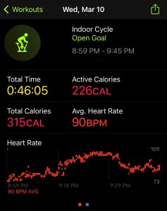 Today’s plan was the 3 x 400 meter speed work, but I completed that yesterday. I wasn’t much in the mood to workout, but we needed to pickup some medication for one of our cats, so we walked to the pharmacy for a short 1.26 mile walk. It was really relaxing. Of course that wasn’t enough to close my rings, so I hopped on the bike for about 37 minutes later in the evening. I am not really sure why my watch had a blip that spiked to 125 BPM. I am just going with anomaly since I was just going at a really relaxed pace.