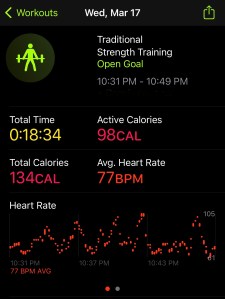 For race week, my Monday plan called for a 4 mile endurance run. I was a bit sore from the hike on Sunday, so I decided to take it easy. Also, I didn’t get done with work until rather late, so it made sense to do something easy. I hopped on the trainer for 47 minutes. To my surprise, that didn’t close my rings, so I went on the treadmill for a 10 minute walk. That closed my rings and I was done. In hindsight, I should have just done a yoga routine and then a trainer ride.