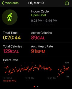 Today’s workout was supposed to be a 6 x 200 meter speed run. However, I wasn’t really feeling like working out at all but needed to get something in. I went to my usual standby and did a 36 minute trainer ride. I made sure to build the resistance to push myself slightly, but overall I was just exhausted and not wanting to do anything.